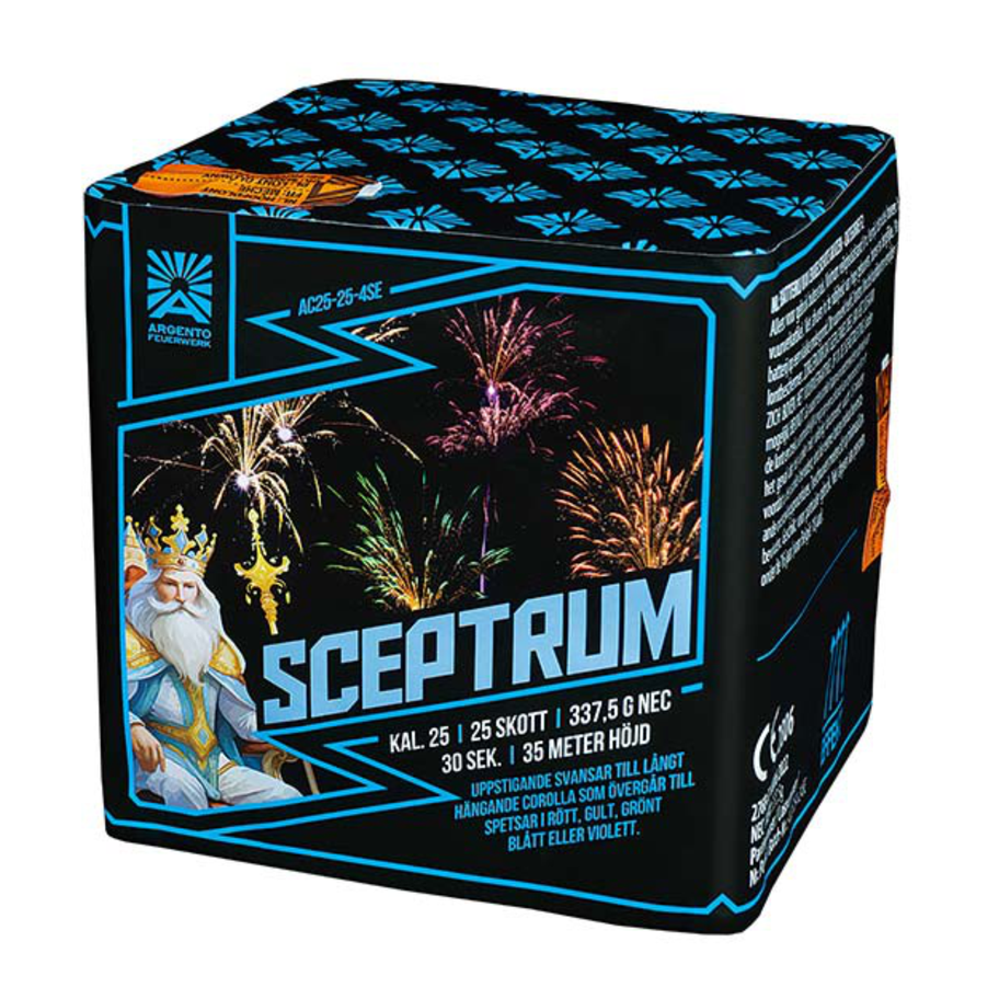 Ytterligare ett batteri i Argentoserien som vi gjort om till 1.3G för att ge det där lilla extra på natthimlen. Färgade svansar till krevader med corollastjärnor som övergår till färgade spetsar. Ett mycket bra batteri för den lilla budgeten eller som start i ett större fyrverkeri.