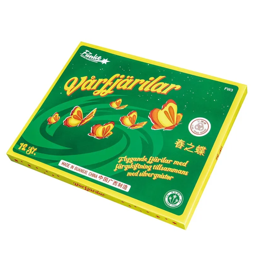 Ett tolvpack flygande spinnare i medelstorlek, en flashback till 70-80 talet både vad det gäller design och prestanda. De både skiftar färg och sprutar silvergnistor på sin färd upp i natthimlen.
